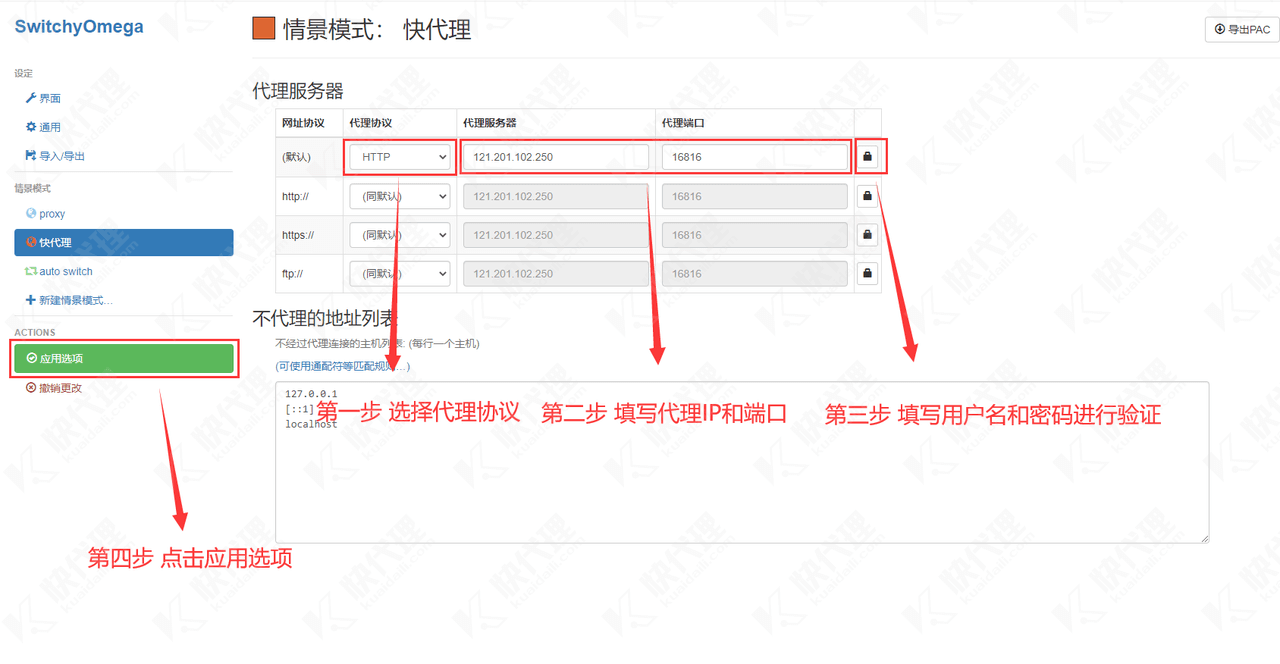 5、选择代理协议,然后填写代理IP和端口并进行验证,最后点击应用选项